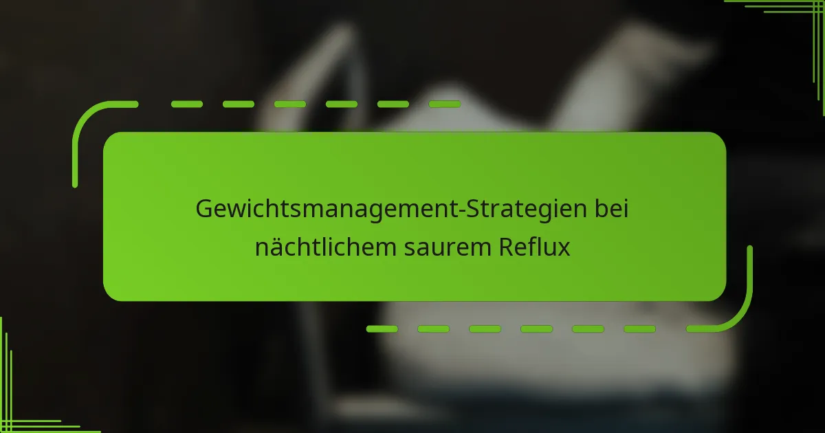 Gewichtsreduktion hat sich als lindernd für viele Personen mit nächtlichem saurem Reflux erwiesen. Selbst eine moderate Gewichtsreduktion kann zu verringertem Bauchdruck und verbesserter Sphinkterfunktion führen, was zu weniger Refluxepisoden führt.